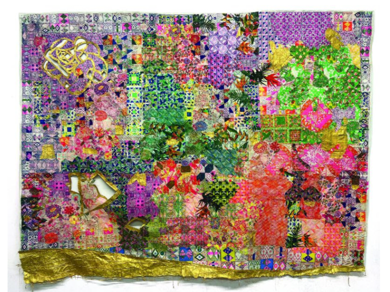 Collage of Risographs and Screenprints on Japanese and hand made fibers papers with sewing and acrylic gouche